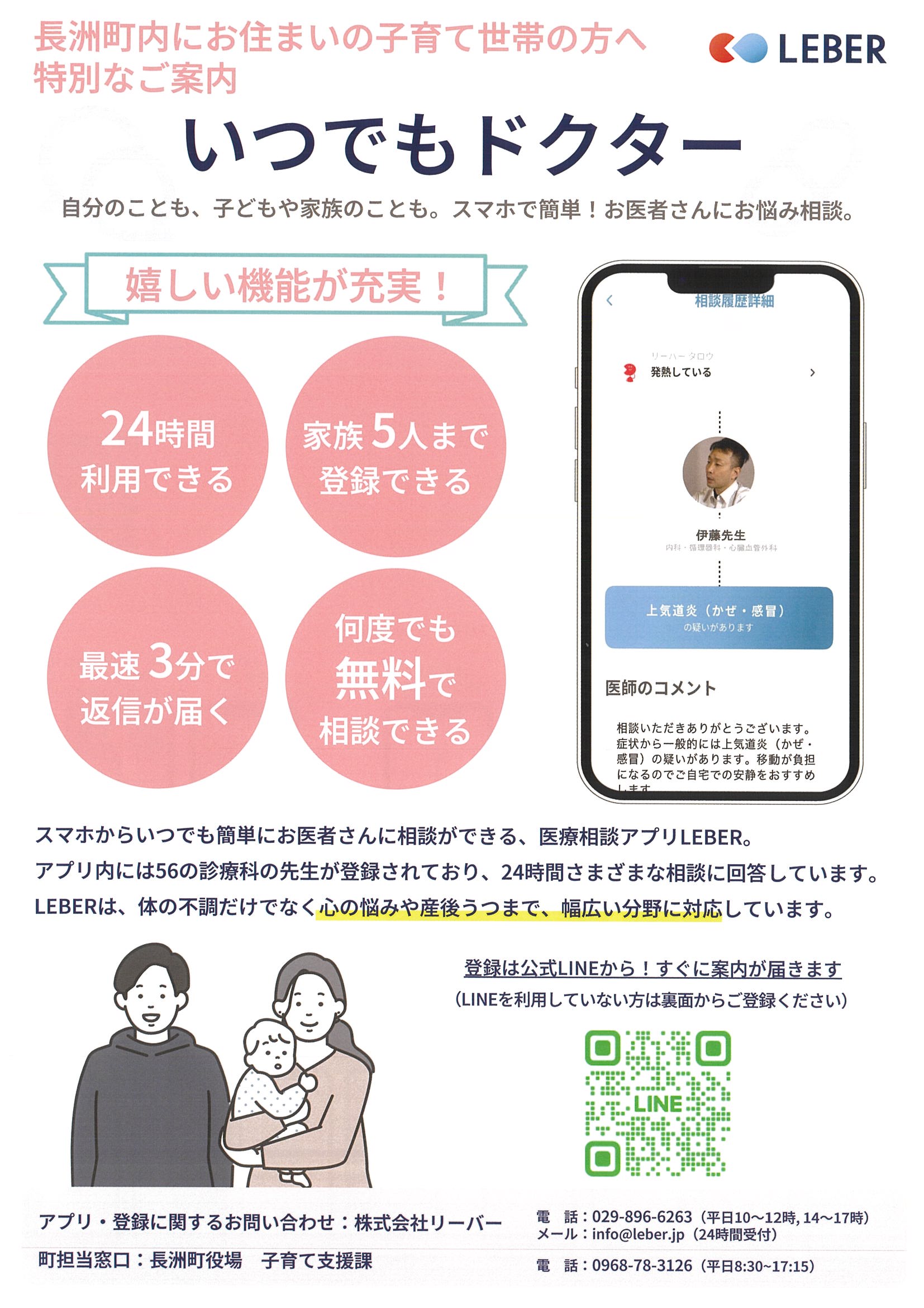 令和7年11月1日から、長洲町内の子育て世帯の方向けに医療相談アプリ「リーバー(LEBER)」の利用を開始します。