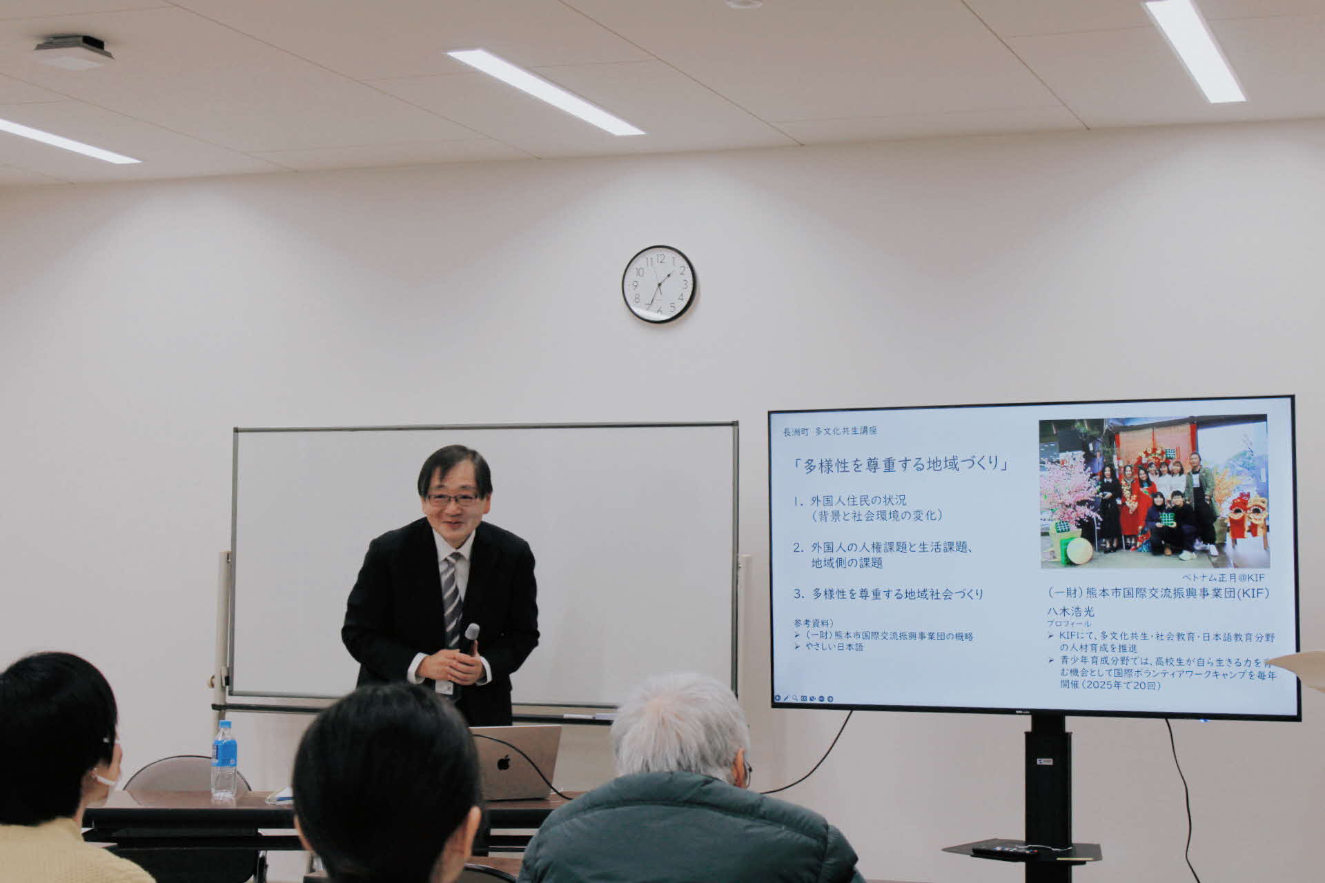 第1部では、熊本市国際交流振興事業団の八木浩光氏より、外国人住民と地域のかかわり方など、外国人住民との共生について学びました。