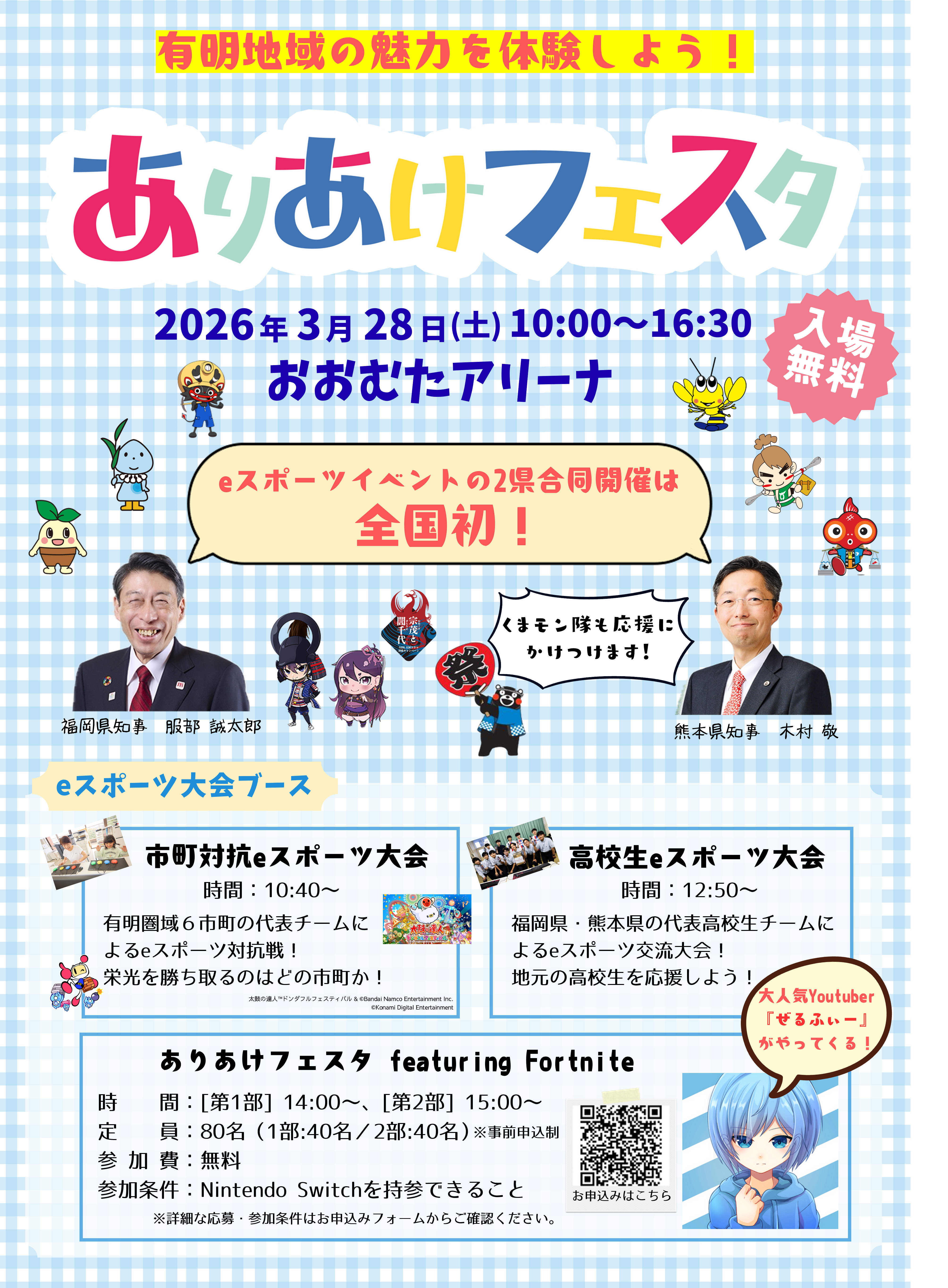 福岡県、熊本県及び有明定住自立圏を構成する市町(大牟田市・柳川市・みやま市・荒尾市・長洲町・南関町)が連携し、県境地域の認知向上及び魅力発信のため、eスポーツを活用した「ありあけフェスタ」を開催します。