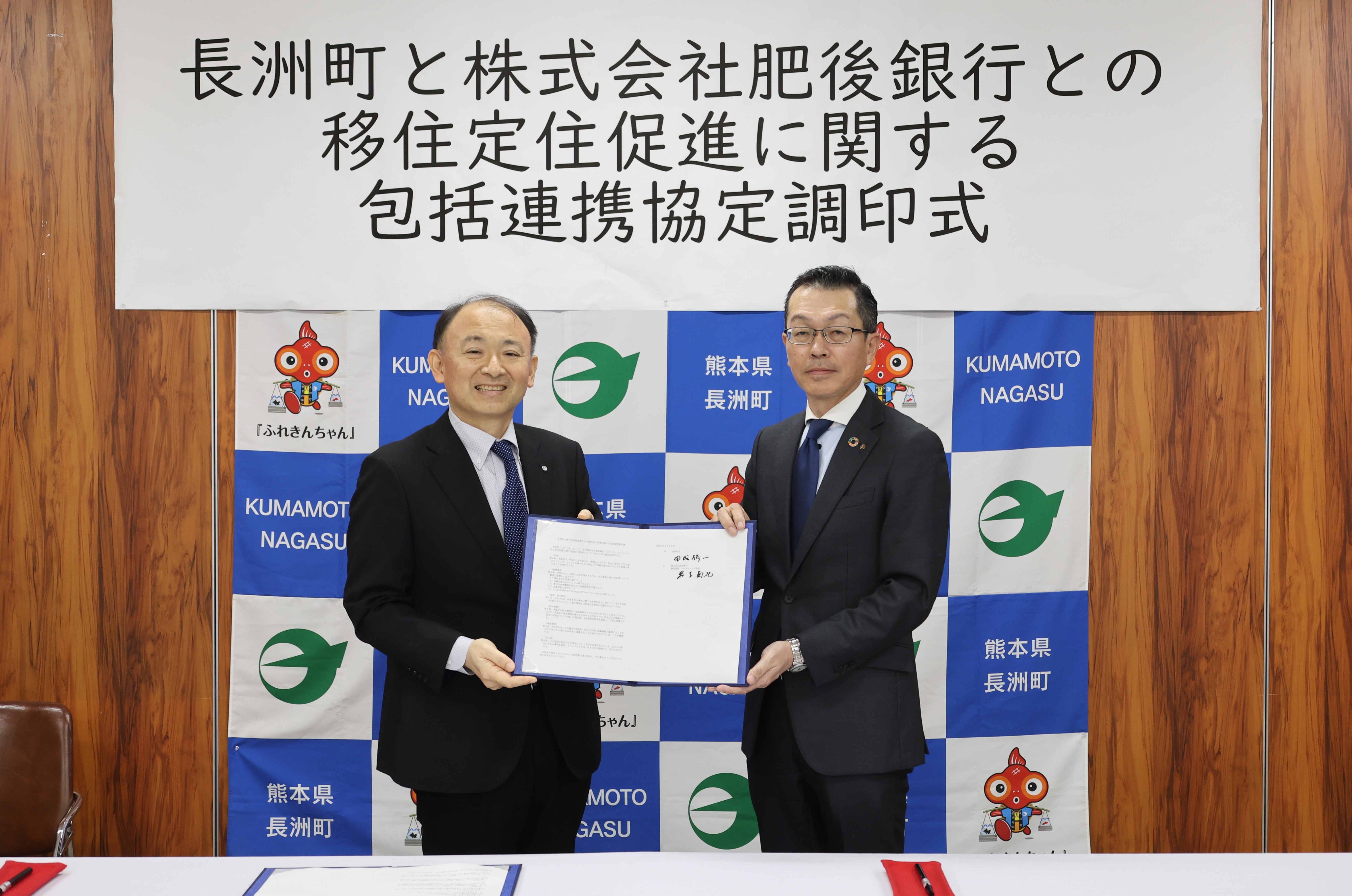 3月26日、長洲町と株式会社肥後銀行は、包括的な連携・協力関係を深め、同行が持つノウハウや資源を活用し本町の移住定住促進策に関する情報を提供することで、人口減少社会に対応した持続可能なまちづくりを推進するため、包括連携協定を締結しました。