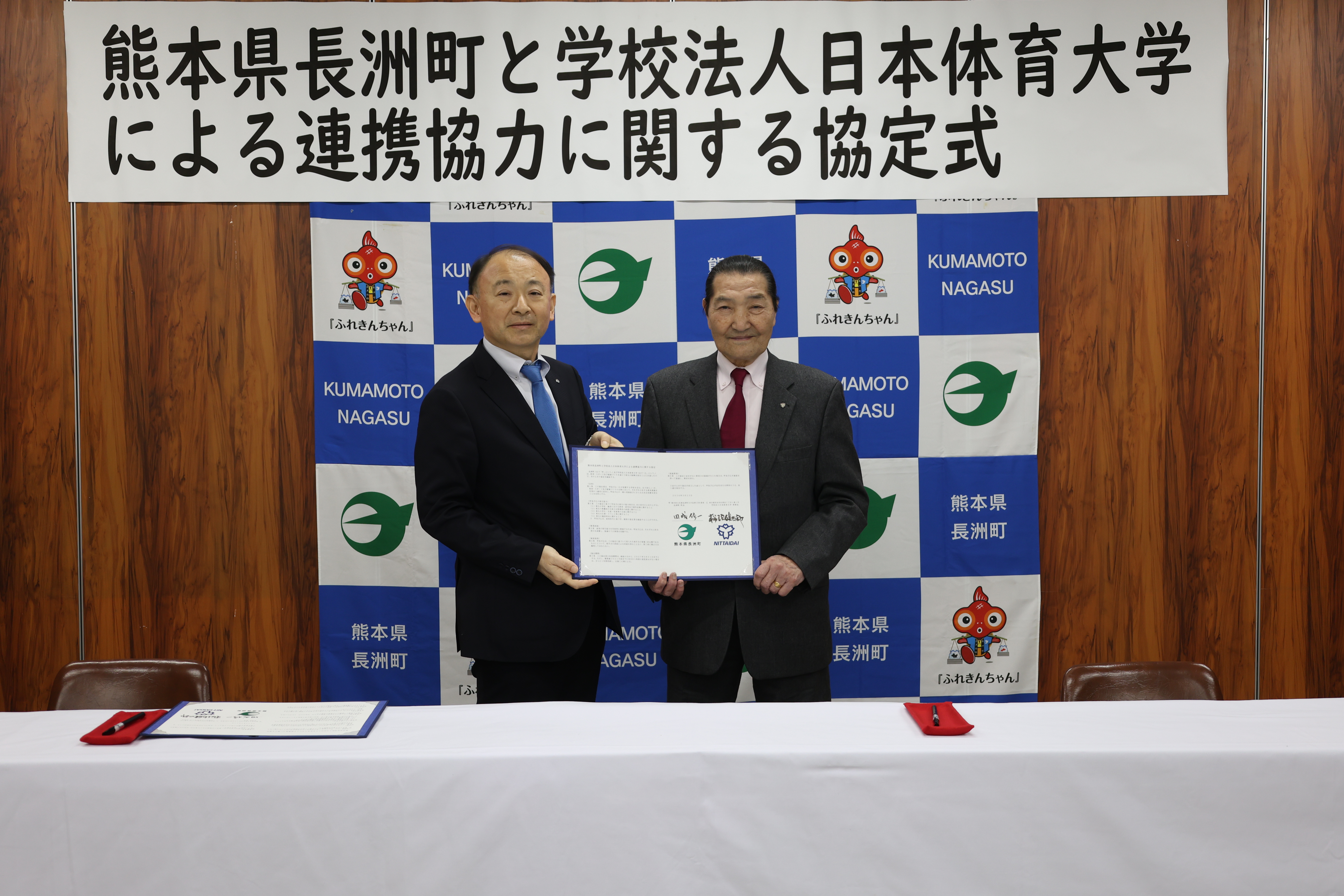 3月23日、長洲町と学校法人日本体育大学は、それぞれが持つ教育資源や人的資源を活用して「体育・スポーツ・健康づくり」の各分野における取り組みを推進し、「スポーツと文化による明るく楽しいまちづくり」を実現するため、自治体連携協定を締結しました。